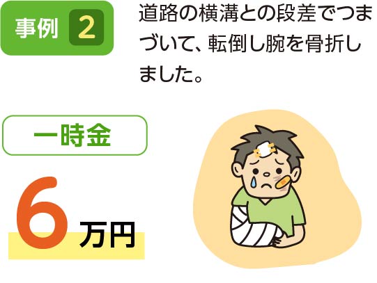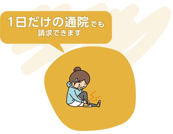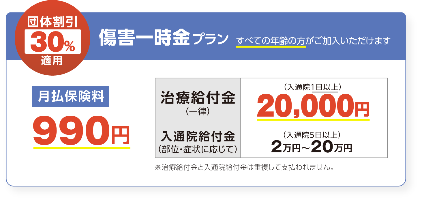 入院または通院が5日以上の場合、傷害一時金払入通院給付金(2万円)の1倍、3倍、5倍または10倍の保険金をお支払いします。ただし、傷害一時金払治療給付金と重複して支払われません。
