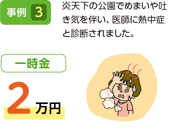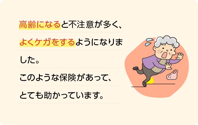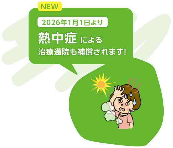 ※「急激かつ偶然な外来の事故」により、保険の対象となる方(被保険者)が、医師等による治療を必要とするケガや、熱中症と診断された場合に保険金をお支払いします。